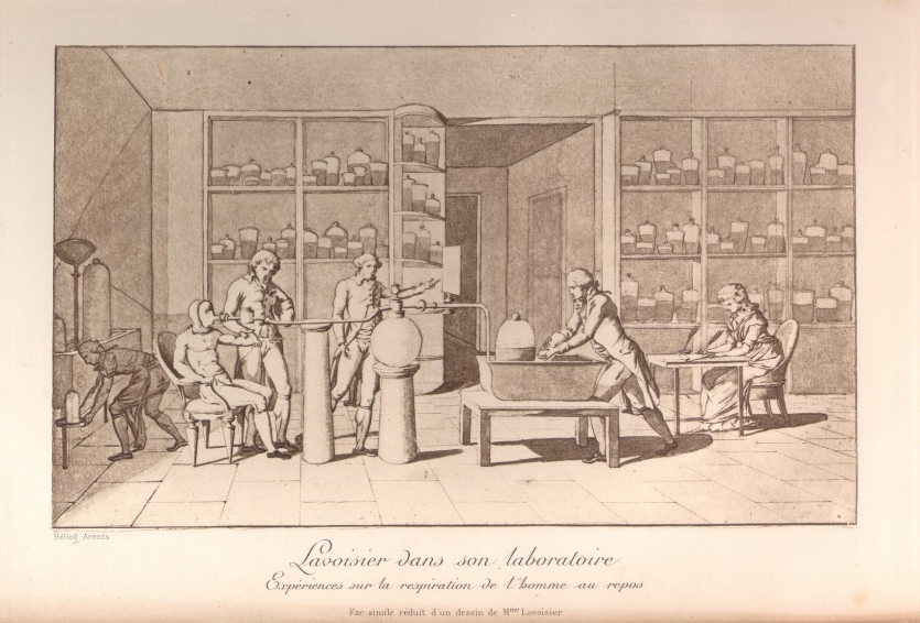 Lavoisier의 아내인 Ann은 그림을 공부한 사람이었어요. 그래서 Lavoisier의 연구실 장면을 그림으로 남겼는데 그것이 지금까지 내려옵니다. 예를 들면 이렇습니다.