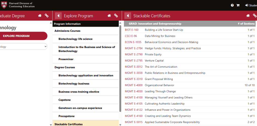 제가 받으려고 생각하는 학위는 ALM in Biotechnology at Harvard Extension School 입니다. 이 학위는 총 12과 목 (48학점)을 받는 프로그램인데 적어도 세가지 트랙이 가능합니다.
