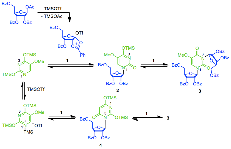 그 이전까지는 Furanose chloride에 Mercury (Hg)를 이용해서 Nucleobase (염기)와 Furanose (5탄당)을 연결해야 했고 이 반응은 Toxic할 뿐만 아니라 수율도 좋지 못했고 또한 beta- vs alpha- 비율도 좋지 못했습니다. 여기서 beta-는 염기가 자연상에 존재하는 위로 붙는 것을 말하고요 alpha-는 반대로 아래로 붙는 것을 말해요. 그러니까 결국 beta-로 붙어야 좋겠죠.
