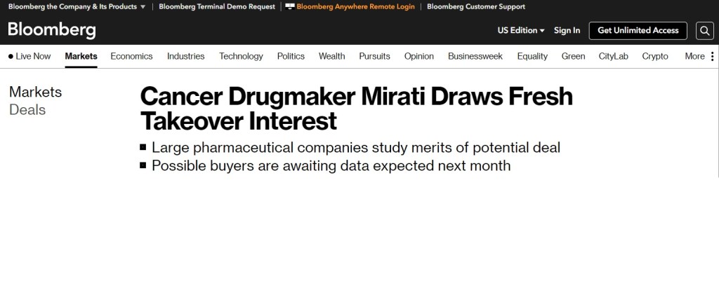 오늘 Bloomberg에 Mirati Therapeutics에 대한 기사가 나와서 글을 남기려고 합니다.
