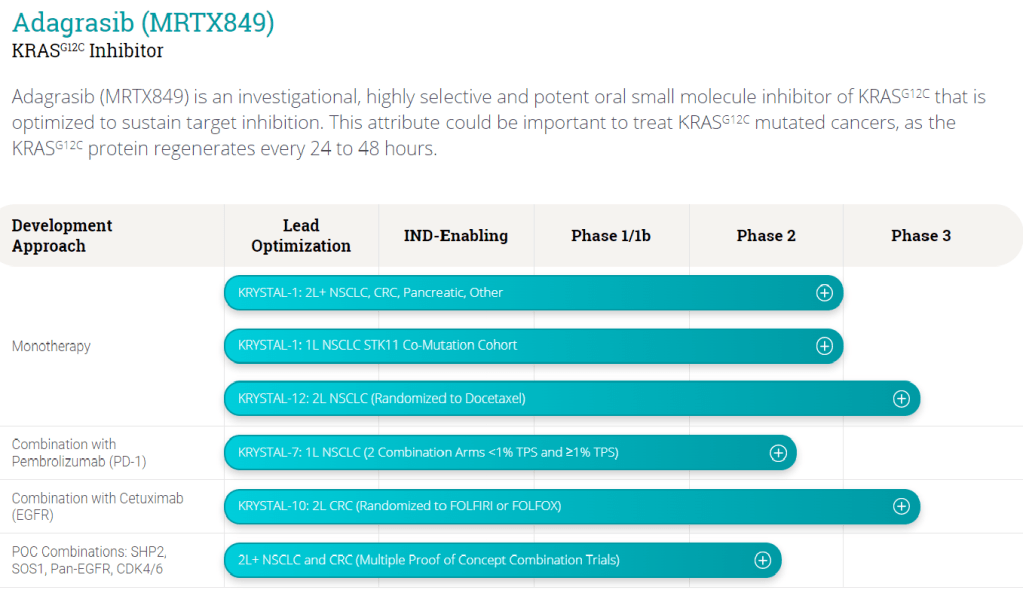 Mirati Therapeutics의 주력 개발약품은 KRASG12C Inhibitor인 Adagrasib (MRTX849)라는 약물인데 이 약물은 Array Biopharma – Pfizer에 M&A됨 – 에서 개발한 약물을 구매한 것입니다.