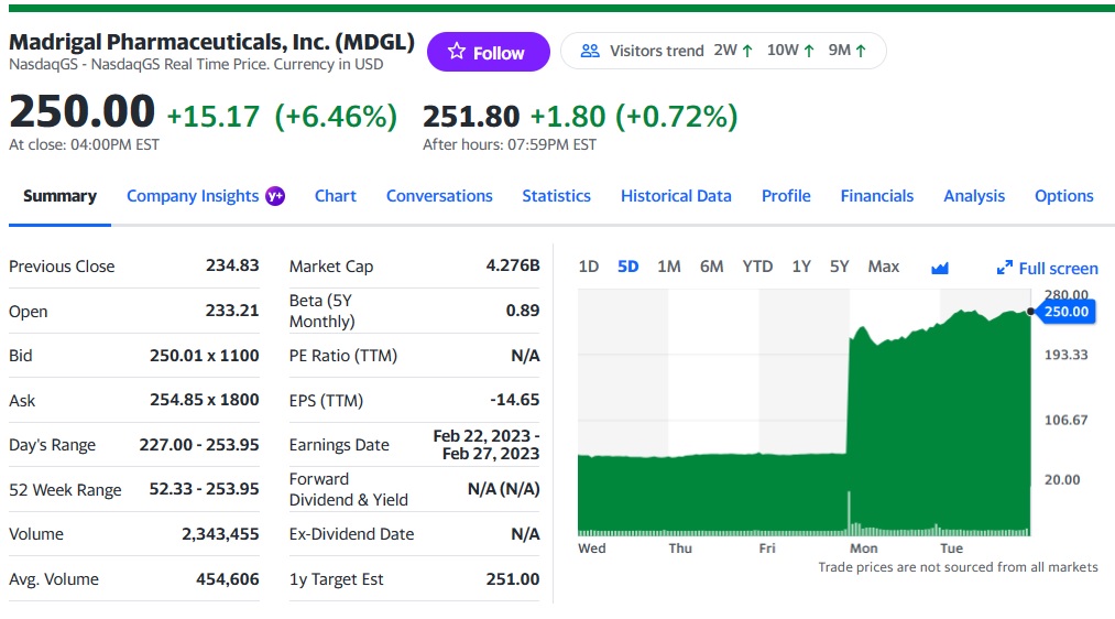 Madrigal Pharmaceuticals는 2016년에 Synta Pharmaceuticals와 합병한 회사입니다. Synta Pharmaceuticals가 흑색종 (Melanoma) 신약 3상을 실패하는 바람에 결국 Madrigal Pharmaceuticals와 1:2로 합병을 했습니다.