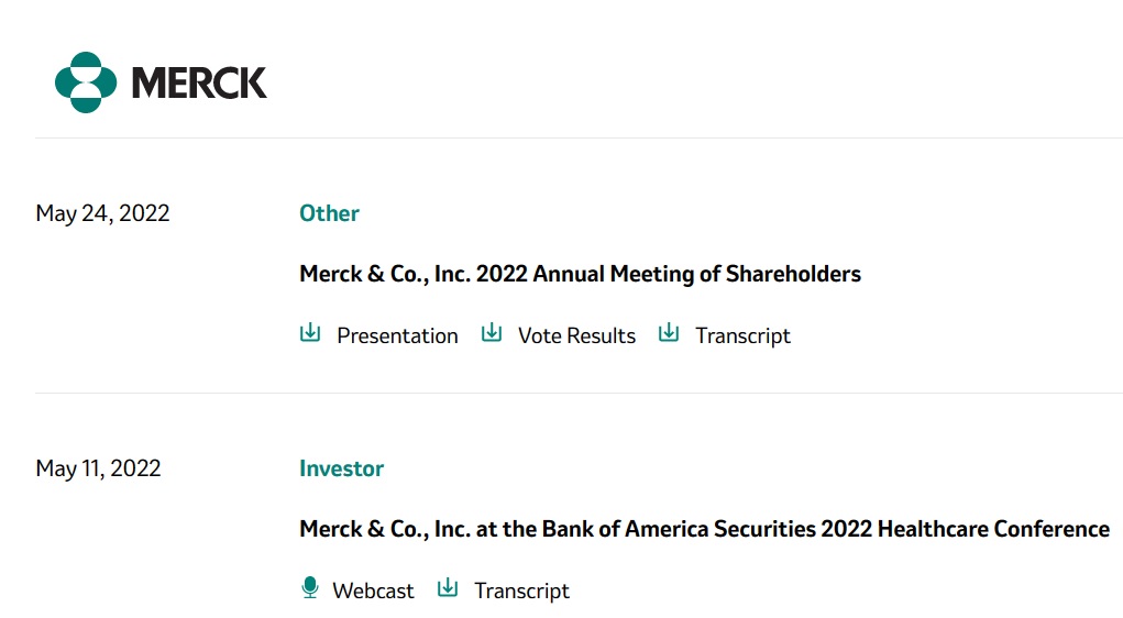 클릭하고 들어가서 “Past Events“를 누르면 각각의 연도에 발표한 내용들이 모두 나와 있습니다. 제가 Merck를 좋아하는 이유는 친절하게 “Transcript“를 함께 만들어 주기 때문인데요. 기업 CEO, CSO, CTO와 같은 최고위급 임원들의 수준높은 발표를 공부할 수 있는 너무나 좋은 도구입니다.