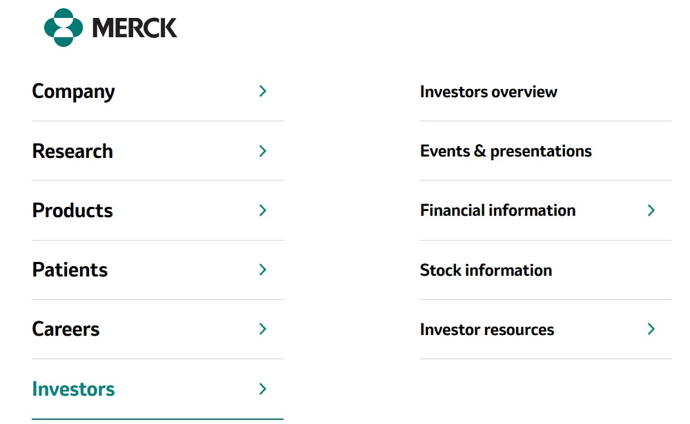 모든 상장회사들은 투자자 보호를 위해 홈페이지에 “Investors” 메뉴가 별도로 있습니다. Merck의 경우에는 아래와 같이 Investors 메뉴 안에 5가지의 또다른 메뉴가 나타나죠. – (1) Investors overview (2) Events & presentations (3) Financial information (4) stock information (5) Investor resources 입니다. 이 중에서 우리가 관심이 있는 것은 (2) Events & Presentations 입니다. 여기를 클릭합니다.
