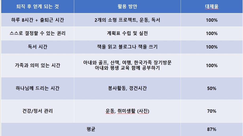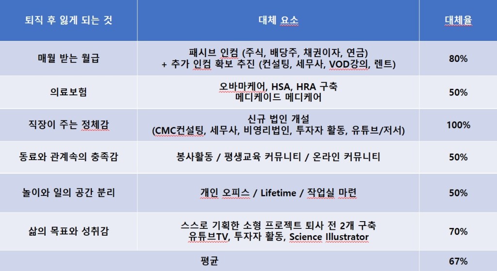 먼저 퇴직을 하게되면 잃게 되는 것들을 나열하고 퇴직 후 이것을 어떻게 대체할 것인지에 대해서 쓰고 대체율을 나름대로 계량화합니다.