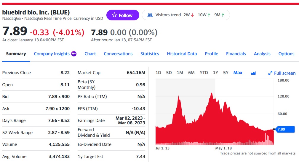 Bluebird Bio는 1992년에 설립된 유전자치료제 Biotech 기업으로 현재 소재지는 미국 Massachusetts주 Cambridge이고 직원수는 519명이며 현재 시가총액은 $654M 입니다.