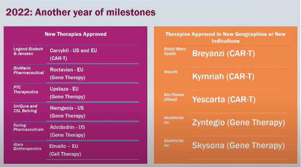 2022년은 유전자치료제 및 세포치료제 승인 개발 역사의 큰 획을 이룬 해입니다. 혁신적인 신약개발에서 거의 항상 겪게 되는 커다란 부침을 극복하고 중요한 신약들이 많이 승인되었습니다.