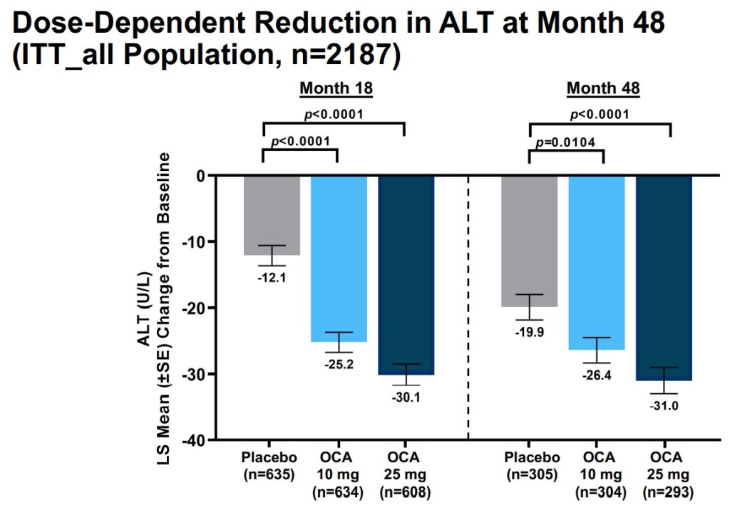 당시 10mg 약물군과 25mg 약물군에서 각각 11.1%, 11.9%가 개선된 반면 Placebo 대조군에서는 9.9%가 개선되어 사실상 효과가 거의 없는 것으로 결과가 나온거죠. 당시 Intercept에서는 하지만 간이 경화되는 과정에는 개선되는 것을 보였다고 발표를 한 바 있습니다.