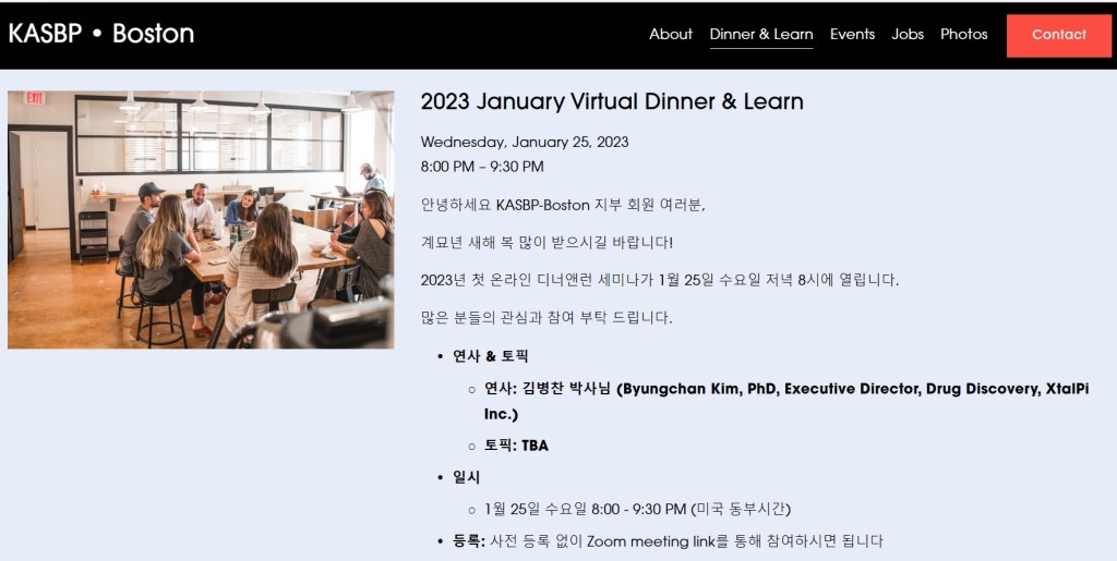 2023년도 1월이 거의 끝나가는군요. 오늘은 KASBP (한국제약인협회)의 정기월례회인 저녁먹고 배우기 (D&L, Dinner & Learn) 모임이 있었습니다. Zoom meeting으로 온라인으로 하는 모임인데 30여분 들어오신 것 같습니다.