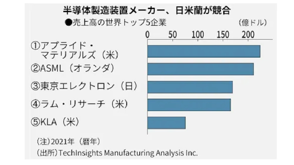 반도체를 생산하려면 반도체 장비가 중요한데 현재 세계 5대 반도체 장비업체는 미국기업 Applied Materials (AMAT), Lam Research, KLA 이렇게 3개이고 네델란드의 ASML과 일본의 도쿄 일렉트론이 각각 2위와 3위를 차지하고 있습니다.