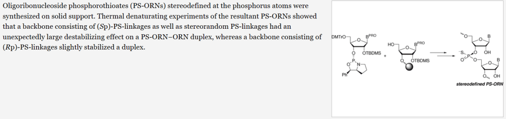 2009년에 동경과학대 (Tokyo University of Science)의 Wada Takeshi 교수팀은 Journal of Organic Chemistry 논문에 Chiral Oligonucleotide를 제조할 수 있는 방법을 보고합니다.