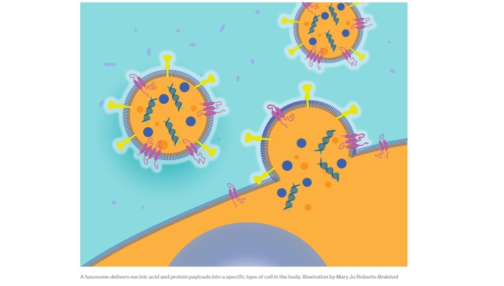 Fusogens function as remarkable mechanical enzymes that can overcome the repulsive forces of bringing two lipid membranes together and achieve close to 85% efficiency in membrane fusion, making them over 100 times more efficient than cationic lipids. In addition, fusogens can have exquisite cell specificity, fusing only to cells that display a target ligand, such as a surface receptor, lipid, or sugar. Enveloped viruses, like SARS-CoV-2, HIV, and measles, rely on fusogens to seek out and deliver their genome only to their target cells. The founding team, using a combination of bioinformatics and primary searching, built the first proprietary database of more 20,000 fusogens across all functions and branches of the tree of life, and they realized that fusogens could be modularly reprogrammed to potentially target any cell type in the human body. They hypothesized that by harnessing fusogens they might be able to solve the intracellular delivery challenge.