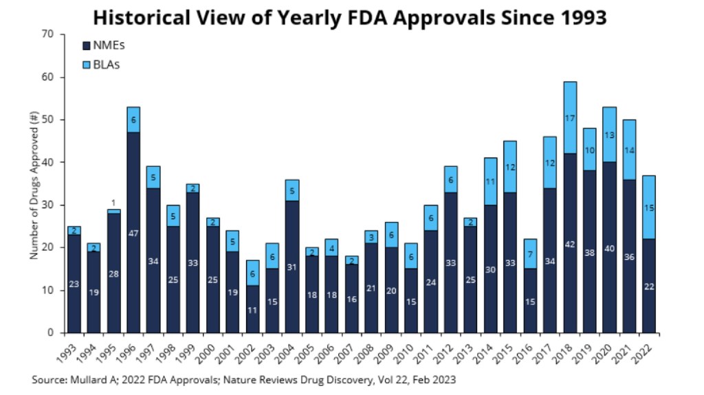 새로운 신약 플랫폼의 개발은 단기간에 완성되는 것이 아니라 30-40년의 긴 시간동안 성장하며 성숙하는 매우 지단한 작업이다. 아래는 1993년부터 2022년까지 30년간 Biologics와 합성신약 (NME)이 FDA에서 승인된 숫자이다.
