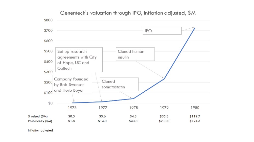 시작은 당연히 쉽지 않았다. 특허를 취득하는 것도 쉽지 않았다. 하지만 이 두사람은 포기하지 않았다. 이들의 꿈에 동조하는 사람들이 생겨나기 시작했다. 그들이 조인하면서 제넨텍은 조금씩 결과를 내기 시작했다. 모두 20-30대의 젊은이들이었던 이들은 과학기술에 전념했고 그 결과 빠른 성장을 이룰 수 있었다. 창업한지 2년만에 Somatostatin을 개발했고 이듬해 Insulin을 개발했으며 창업한지 4년만에 기업공개 (IPO)를 통해 기업가치는 $700M (8,400억원)에 이르렀다.