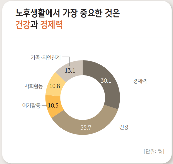 우선 노후생활에서 중요하다고 생각하는 것은 건강과 경제력으로 나타났습니다. 사회활동이나 여가활동은 상대적으로 중요도가 낮게 나타났군요.