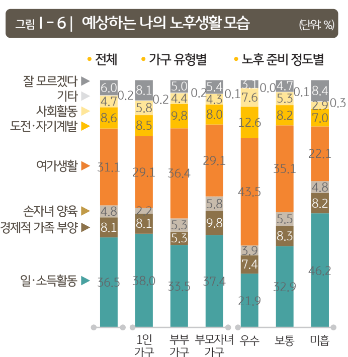셋째, 예상하는 노후 생활 모습은 여가생활 > 일, 소득활동 > 도전, 자기계발 > 가족부양 순으로 나타났습니다. 부부가 함께하는 경우에는 혼자사는 사람에 비해 여가생활과 도전, 자기계발에 더 많은 비율을 투자하는 것으로 나타났는데 제 생각에 이유는 일, 소득활동을 부부가 분담하기 때문이 아닐까? 하고 생각합니다. 아마도 부부가 함께 한다면 자연히 여가생활이나 자기계발에 더 시간을 쓰게 되지 않을까 싶네요.