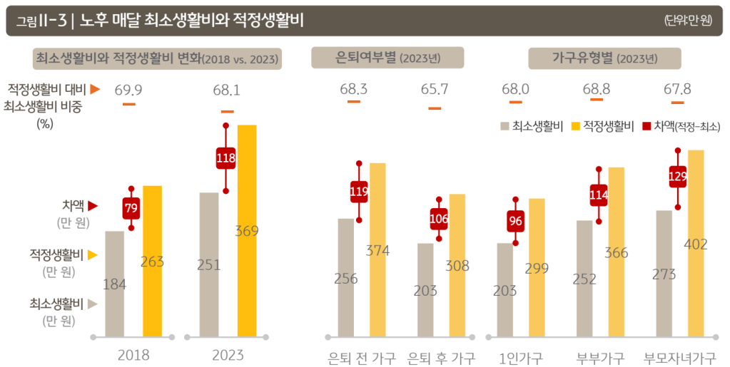 의식주만을 포함하는 최소생활비는 184만원 (2018)에서 251만원 (2023)으로 늘어났는데 최소생활비에 더해서 여행, 여가 및 손수용돈을 합한 적정생활비의 경우네는 263만원 (2018)에서 369만원 (2023)으로 늘어난 것입니다.