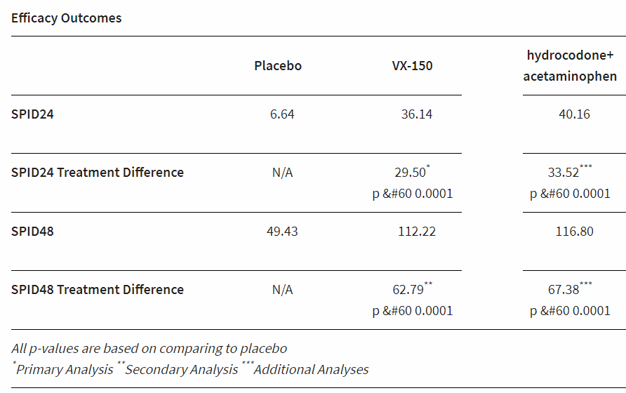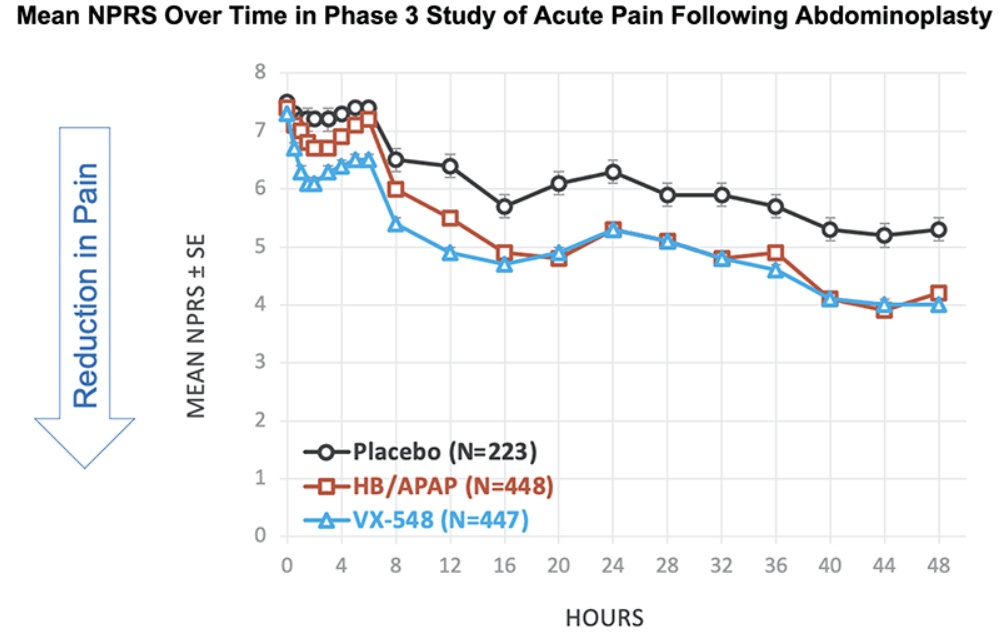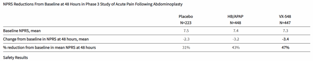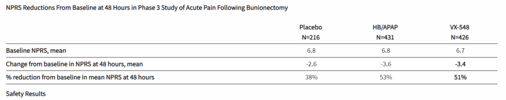 VX-548 had a numerical advantage over HB/APAP in the tummy tuck trial but the difference fell short of statistical significance. In the bunionectomy trial, HB/APAP performed significantly better than VX-548, resulting in a p value of 0.0016. The finding that HB/APAP provides more pain relief than Vertex’s drug candidate in bunion surgery patients complicates the case for VX-548.