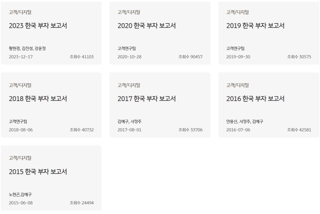 다음으로 보려는 보고서는 우리금융그룹이 내놓은 2023년 서울 부자 보고서입니다. 우리금융의 보고서는 서울에 사는 부자에 대해서 조사한 것이라 흥미롭습니다.