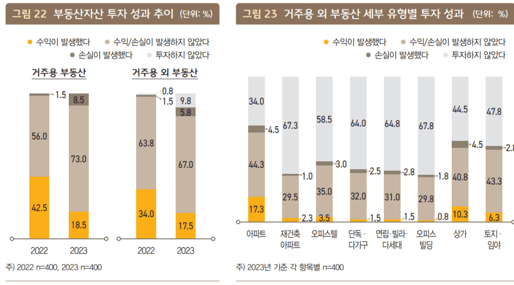 투자용 부동산보다는 거주용 부동산에서 수익이 좀더 나았고 투자형 부동산도 주로 아파트 투자가 그나마 가장 안전한 투자인 것으로 보입니다.