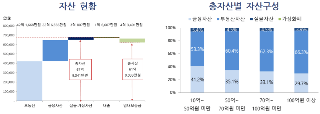 전체 자산이 30억원 미만인 사람을 보면 33% 정도 그러니까 10억원이 금융자산이고 30억 이상이 되어도 금융자산이 50%가 안되니 결국 30억원 금융자산이 있으려면 자산이 근 70억원은 있어야한다는 실현이 거의 불가능한 비현실적인 답에 접근하게 됩니다.