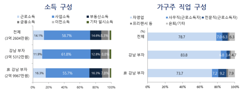 서울 부자들은 거의 모두 돈을 벌고 있습니다. 사업소득이 근로소득보다 높은 것으로 나타나서 자신의 사업체를 운영하고 있다고 할 수 있겠죠. 직업구성 중에서 은퇴한 비율은 10% 이하이고 거의 80%가 자신의 사업을 하고 있군요.