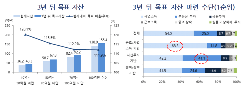 이런 금융자산은 소위 은퇴전문가들이 은퇴를 위해 필요하다고 하는 최소액에 해당합니다. 서울 부자들은 자신의 사업소득이나 부동산 투자소득으로 3년에 10% 정도 자산이 증식되는 목표를 가지고 사는 것으로 나타났습니다.