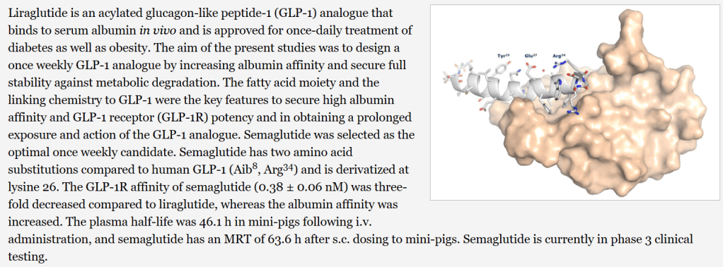 Exenatide는 39개의 아미노산으로 구성된 펩타이드인데 주사제로 개발이 되었고요 새로운 당뇨병 치료제의 개발이 필요했습니다. 또한 GLP-1이 당뇨 뿐만 아니라 체중감소에도 효과가 있는 기전인 것이 밝혀지며 Novo Nordisk는 새로운 GLP-1 R Agonist 개발에 뛰어들게 되고 Semaglutide라는 약물을 얻게 됩니다.