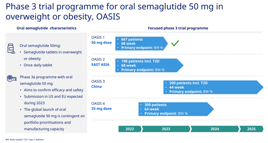 그리고 현재 Weight loss 약으로 50mg oral Semaglutide의 OASIS 임상3상이 진행 중입니다.