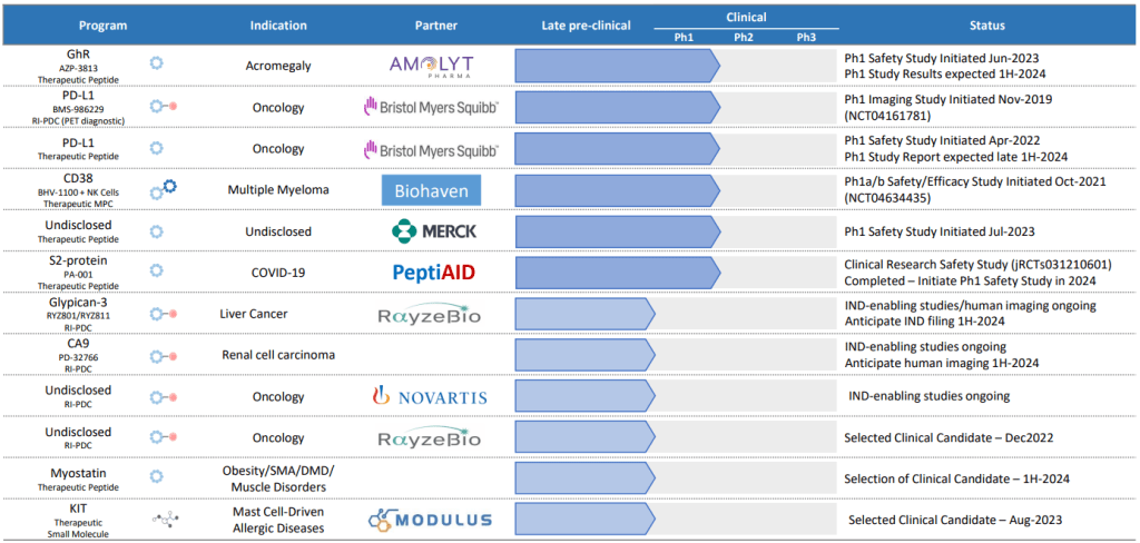 2023년 11월 현재 Peptidream의 Pipeline은 아래와 같습니다. 아직까지는 임상1상이 가장 앞선 단계인 Early-stage입니다. Hit Identification까지는 비교적 빠르게 진행할 수 있지만 역시 Drug Candidates를 얻는데까지 Lead Optimization은 시간이 상당히 걸리는 것 같습니다. 창업한지 18년차가 되었습니다. 지속적인 성장을 통해 언젠가 PeptiDream도 자체적인 개발 프로그램을 갖게 되기를 기대합니다.