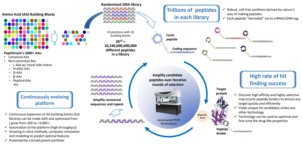 And these macrocyclic peptides can be combined, using a much larger set of amino acids than occur in nature – giving researchers the ability to experiment with many more combinations. PeptiDream’s Peptide Discovery Platform System (PDPS) is a proprietary technology that allows drug researchers to make trillions of peptide libraries. Reid describes PeptiDream as “platform company” that enables his researchers and others to make the process of discovering “hits” — the starting point for developing drugs — more efficient.