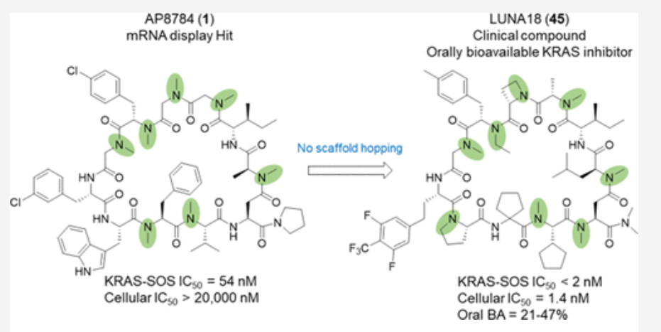 Novartis의 신약개발 Director이면서 Science에서 “In the Pipeline”이라는 블로그를 쓰는 Derek Lowe가 최근에 Chugai가 개발한 LUNA18 (pan-KRAS Inhibitor)에 대해 글을 쓴 것이 있습니다. Derek의 관점은 Chugai 연구팀이 N-alkyl amino acid를 이미 mRNA Display와 Solid-phase synthesizer에 도입을 해서 5번만의 In vitro selection만으로 180 nM active molecule을 찾았다는 점을 아주 높이 평가하고 있습니다. (Big Pharma Library Screening으로도 이런 것은 얻을 수 없다는 것을 강조하면서).