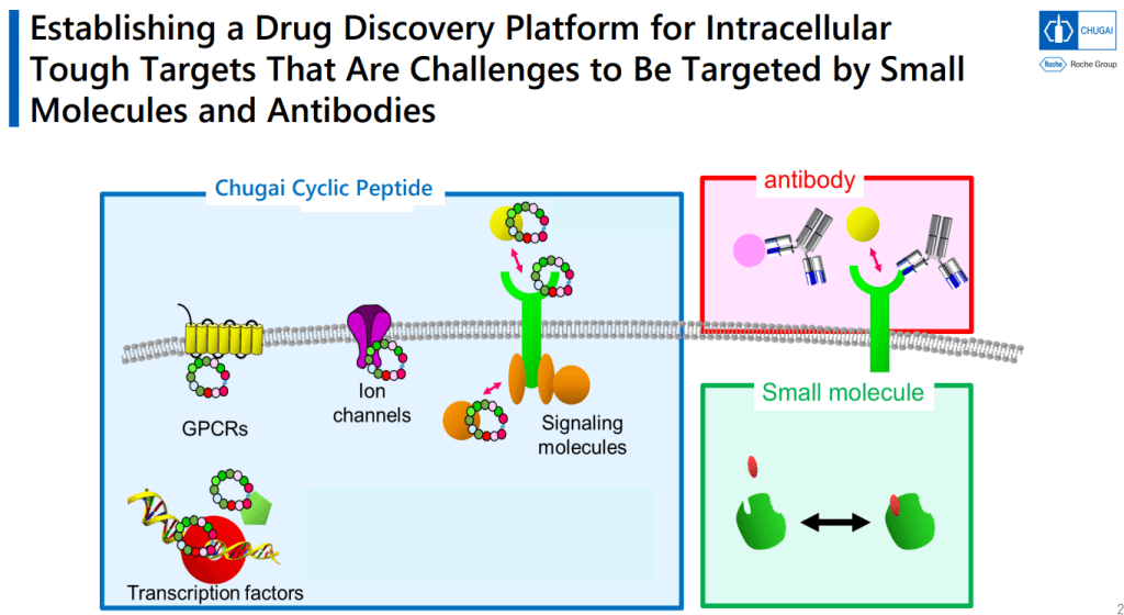 Chugai 제약은 Small molecule과 Antibody 신약개발은 오랜 기간 내공이 있는데 최근에 “intracellular Transferring Peptides” 분야에 Positioning을 한다는 전략을 수행하는 중에 있습니다.