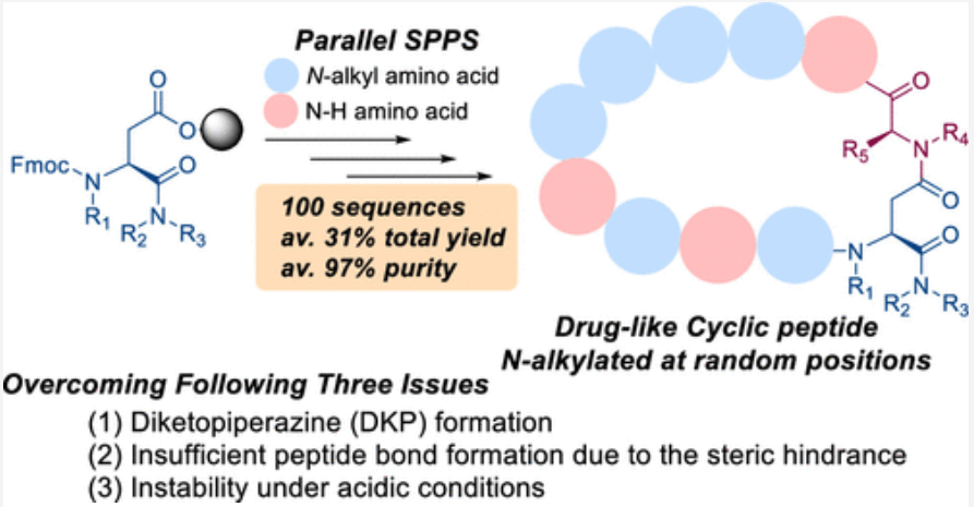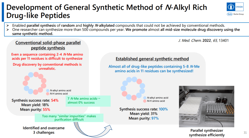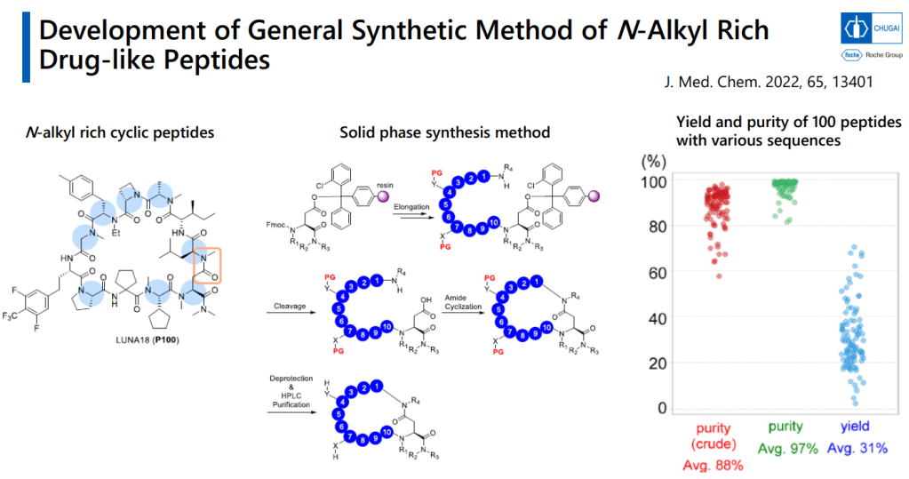 Journal of Medicinal Chemistry 2022년 논문에서 N-alkyl Rich Drug-like peptide synthesis를 개발해서 한 연구원 당 1년에 500개의 Peptides를 만들 수 있도록 했습니다.