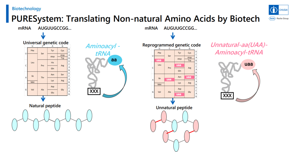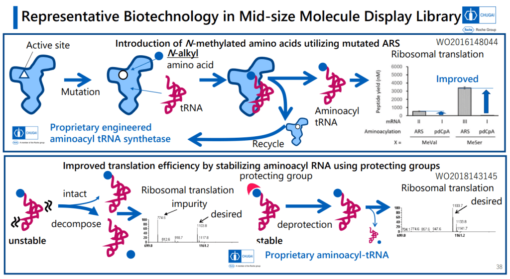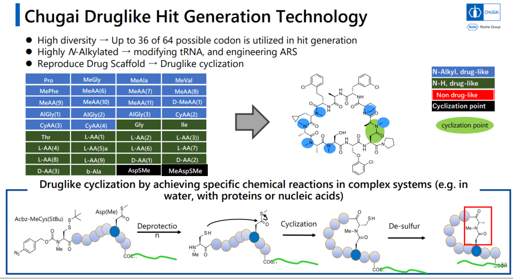 일본의 제약회사 중 하나인 Chugai Pharmaceutical Co. Ltd. (中外製薬株式会社)는 2002년부터 Roche의 계열사로 되어 있는 회사로 신약개발을 하는 회사입니다. Chugai가 최근 mRNA Display Platform을 통해서 Macrocyclic Peptides 를 통한 신약개발을 중점적으로 하고 있는데 그에 대해 얘기를 하려고 합니다.