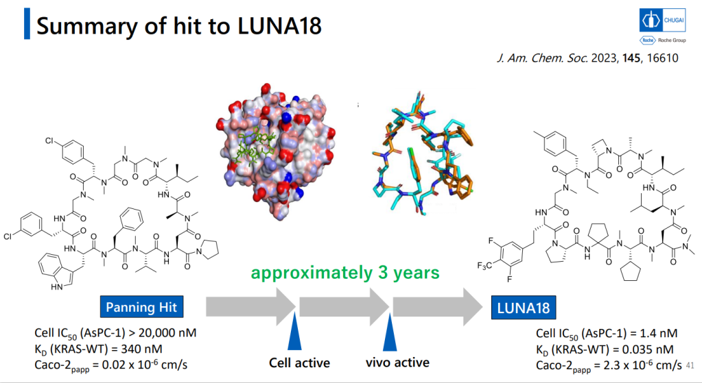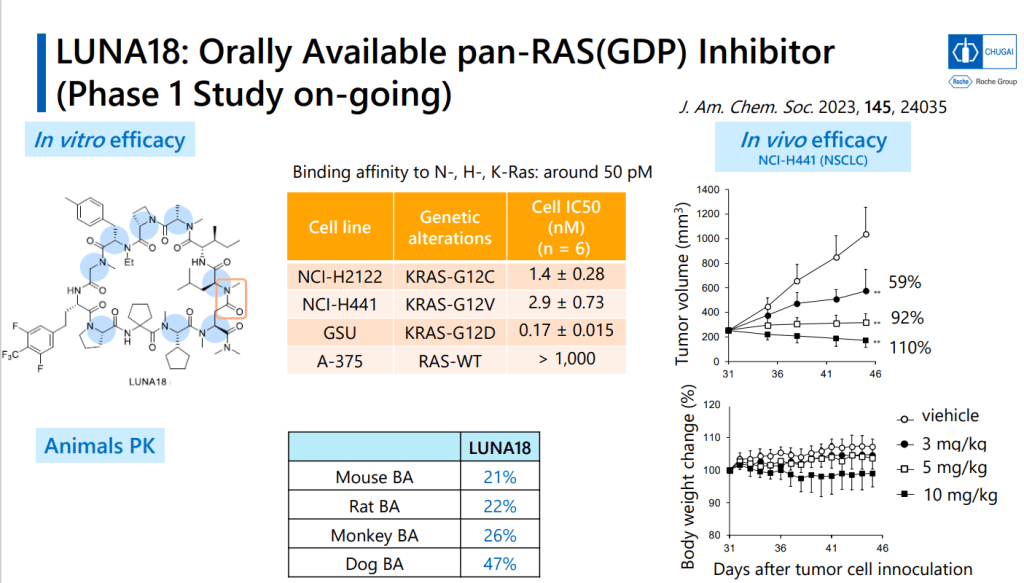 Mid-Size Molecule 중 처음으로 임상에 진입한 물질이 LUNA18입니다. pan-mutant RAS Inhibitor로 개발을 한 것입니다.