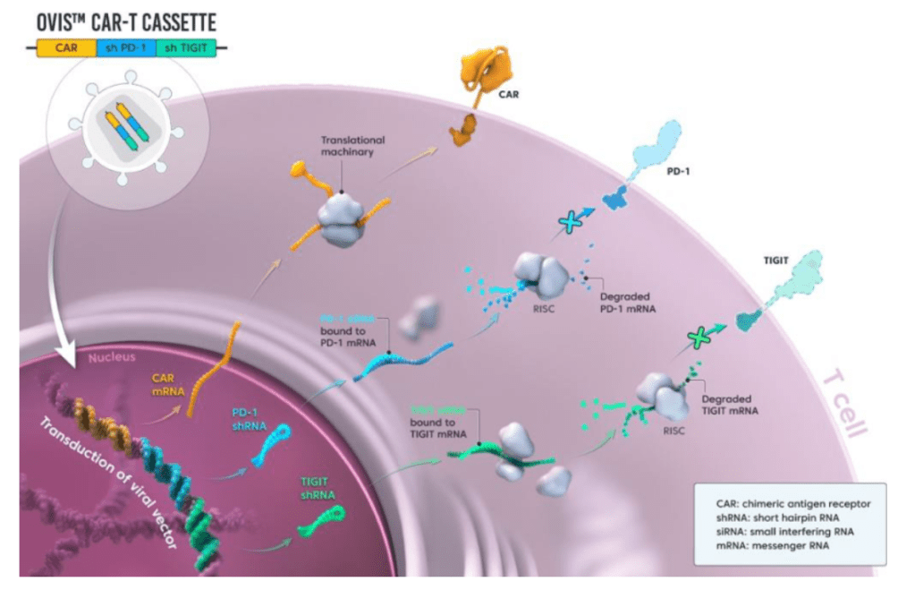 환자 혈액 채취→ 백혈구에서 T세포(면역세포) 분리 → 유전자 조작을 통해 T세포에 특정 암을 인식하는 유전자(CAR)를 삽입 → *T세포에 있는 면역 관문 수용체(PD1, TIGIT) 2종 제거 → T세포 배양 → 환자에게 투약.