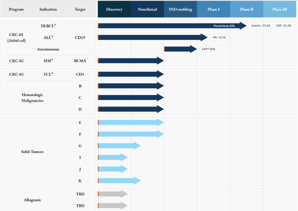 회사의 홈페이지에 개재한 파이프라인은 다음과 같습니다. Anbal-cel은 현재 ALL (급성림프구성백혈병) 환자에 대해 임상1상을 진행 중에 있습니다.
