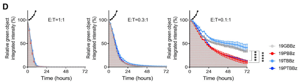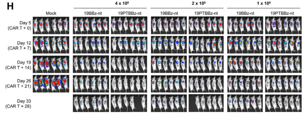 19PBBz (PD-1 downregulation) 19TBBz (TIGIT downregulation)에 비해 19PTBBz (PD-1/TIGIT Dual downregulation)이 CAR-T 치료의 지속성이 높은 것을 보여줍니다.
