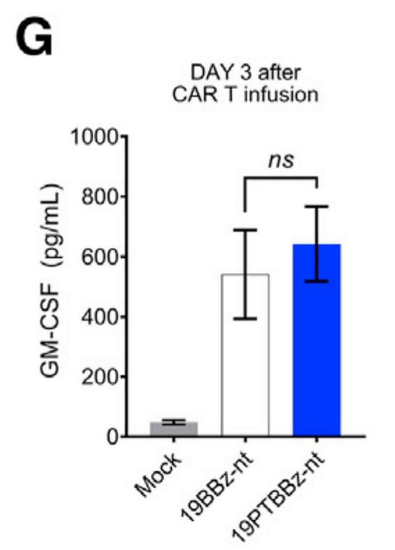 19BBz-nt에 비해 19PTBBz-nt (PD-1/TIGIT Dual downregulation)에서도 백혈구의 GM-CSF level이 높게 나온 것으로 볼 때 CAR-T치료제의 독성인 CRS (Cytokine Release Syndrome)과 ICANS (Immune effector Cell-Associated Neurotoxicity Syndrome)이 적을 것으로 기대할 수 있었습니다. (G)