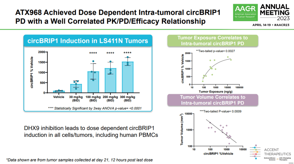 2023년 AACR Meeting에서 DHX9 Inhibitor 중 하나인 ATX968에 대해 발표를 했는데 mRNA circBRIP1 PD 에 Dose-Dependent Efficacy가 있슴을 보고했습니다.