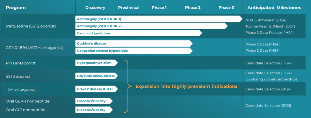 현재 Crinetics Pharmaceuticals의 파이프라인은 아래와 같습니다.