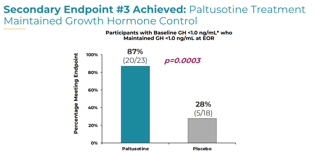 Crinetics reported that 25 (83%) patients receiving paltusotine achieved the primary endpoint of maintaining IGF-1 levels below 1.0 times the upper limit of normal (ULN) after 36 weeks, compared to only 1 (4%) of patients receiving the placebo (P <.0001).