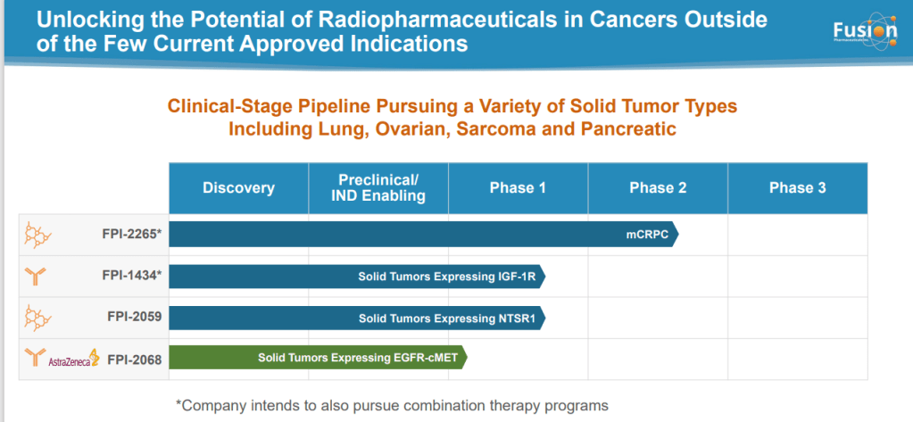Fusion’s pipeline is led by a PSMA-directed radiotherapy, FPI-2265, that is in phase 2 development as a treatment for metastatic castration-resistant prostate cancer (mCRPC). FPI-2265 delivers actinium-225, an alpha radiopharmaceutical that emits more energy than beta therapies such as Novartis’ Pluvicto. By getting the payload to cells that express PSMA, Fusion believes it can improve outcomes in mCRPC.