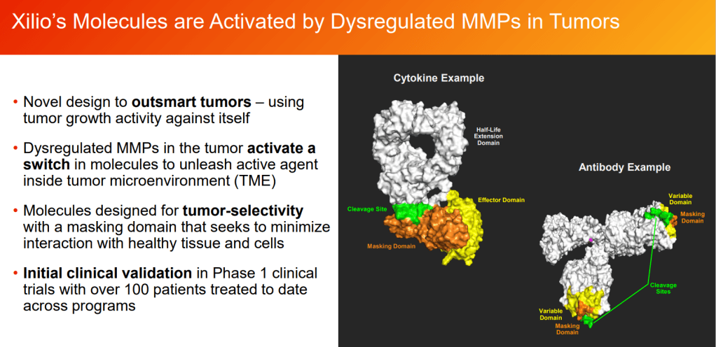 Working with technology licensed from City of Hope and Thomas Jefferson University, Xilio links the drugs to peptides designed to mask the molecules until they reach the tumor microenvironment. The linker is cleaved by proteases found near to tumors, causing the targeted unmasking of the drug.