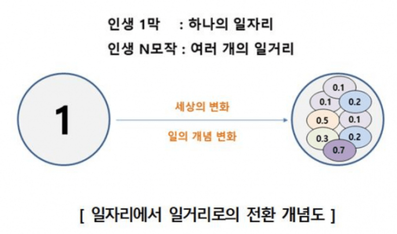 첫째, ‘새 부대’는 ‘시대의 변화에 따른 일자리, 일거리 개념의 재정립’이다. 인생 1막에서는 ‘하나의 일자리’에서 근무했다면, 그 이후에는 ‘여러 개의 일거리’ 개념으로 출발할 필요가 있다. 더 이상 다수가 정규직으로 일할 수 있는 세상이 아닌 계약직, 파트타임, 시간제, 프리랜스 등의 이름으로 일하는 세상이 왔기 때문이다. 인생 1막의 온전한 ‘하나의 일자리’가 ‘1’이라는 수입이나 일하는 시간적 볼륨을 안겨줬다면, 이후의 삶은 ‘여러 개의 일자리’에서 ‘0.1, 0.3….’ 등의 수입을 만들어가면서 온전한 ‘1’을 지향해 나가야만 한다. 좀 더 확장해보면 이전에는 생계 목적, 가족부양, 부모님의 결정 등 때문에 ‘1’을 지향하면서 일했다면 이제는 세상의 변화를 수용하는 자신의 결정에 따라 ‘0.1….’에서부터 출발한다는 개념이다. 물론 개인에 따라 출발점은 다를 수 있다.