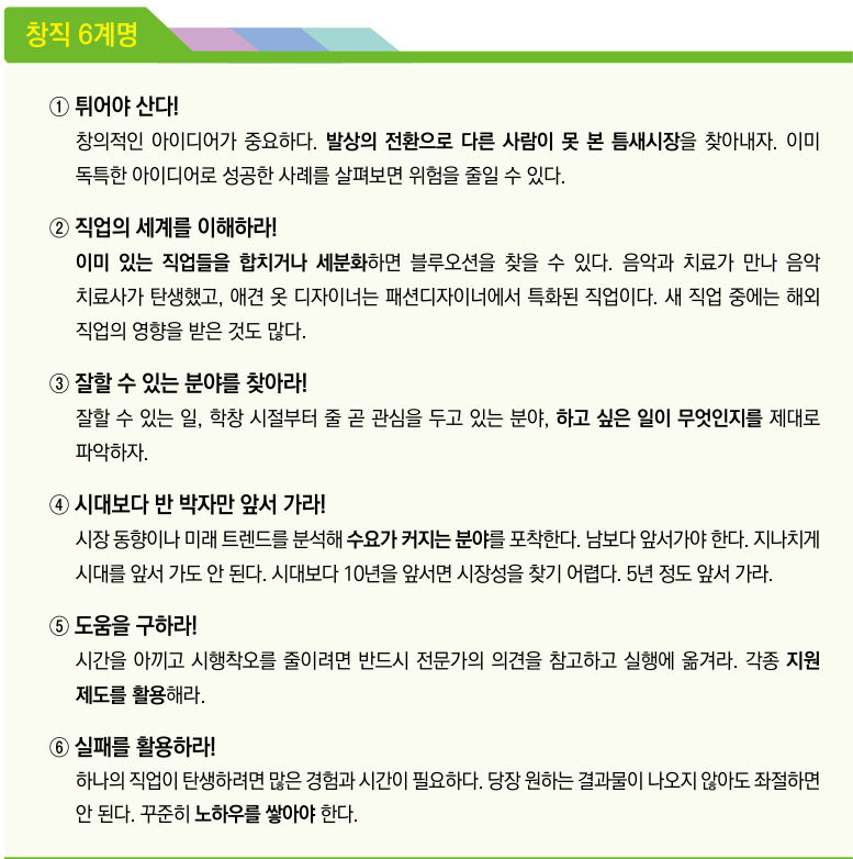 이 안내서에는 창업‧창직‧재취업 준비사항과 성공 사례, 유용한 정책과 웹사이트 등 다양한 정보를 담고 있다. 원문은 한국고용정보원 홈페이지-발간물-직업‧진로정보서 메뉴에서 파일을 내려받아볼 수 있다.
