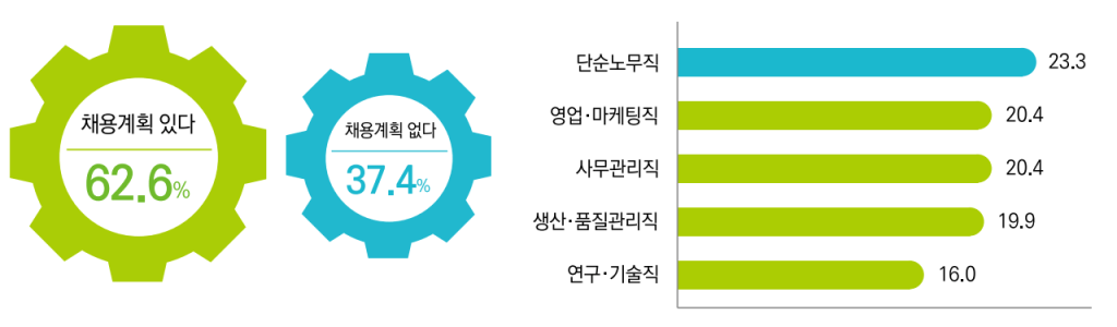 신중년 채용계획을 인사담당자에게 물었을 때, 단순노무, 영업직이 43.7% 이었다.