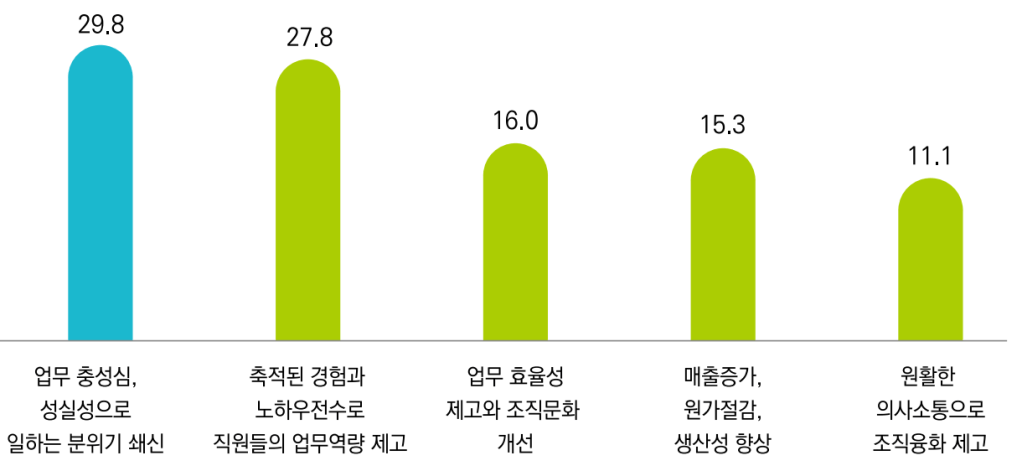 신중년 채용의 장점으로 인사담당자들이 꼽은 것은 다음과 같다. 대부분 무형적인 것이 높은 것이 아쉽다. 실제 매출증가, 원가절감 등 생산성 향상에 기여했다고 말한 것은 15%에 불과했다.