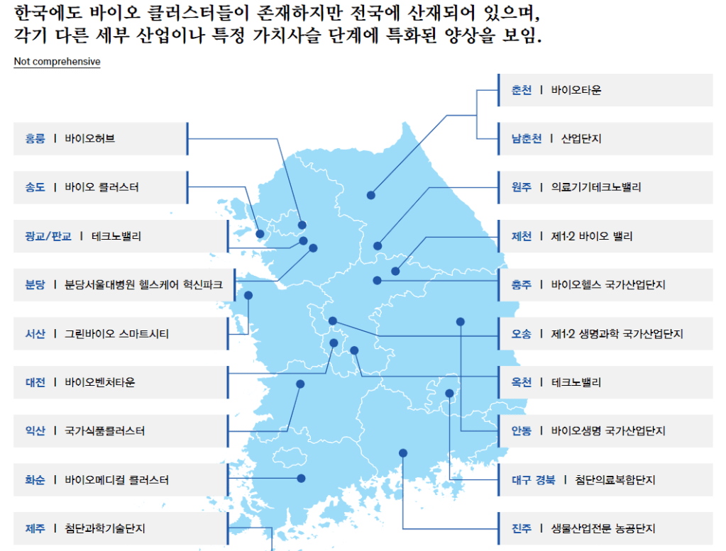 한국의 클러스터들이 여러곳에 분산되어 있는 것은 효율적이지 못합니다. 집중화되는 것이 좋을 것 같습니다.